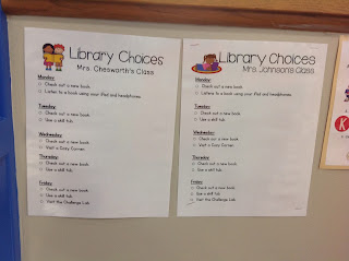 The First Grade teachers had a few different ideas. They actually have two times during the day where the teacher pulls small groups and the other students have station time. So what they want their kids in the library to do looks like this. Even though they have "check out a new book" only on Monday the kids can check out any day they need to return their books.